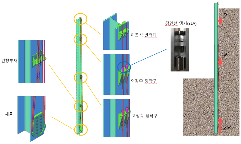 엄지말뚝 배면측에 프리스트레싱을 통해 토압에 의한 캔틸레버 변위를 억제 -